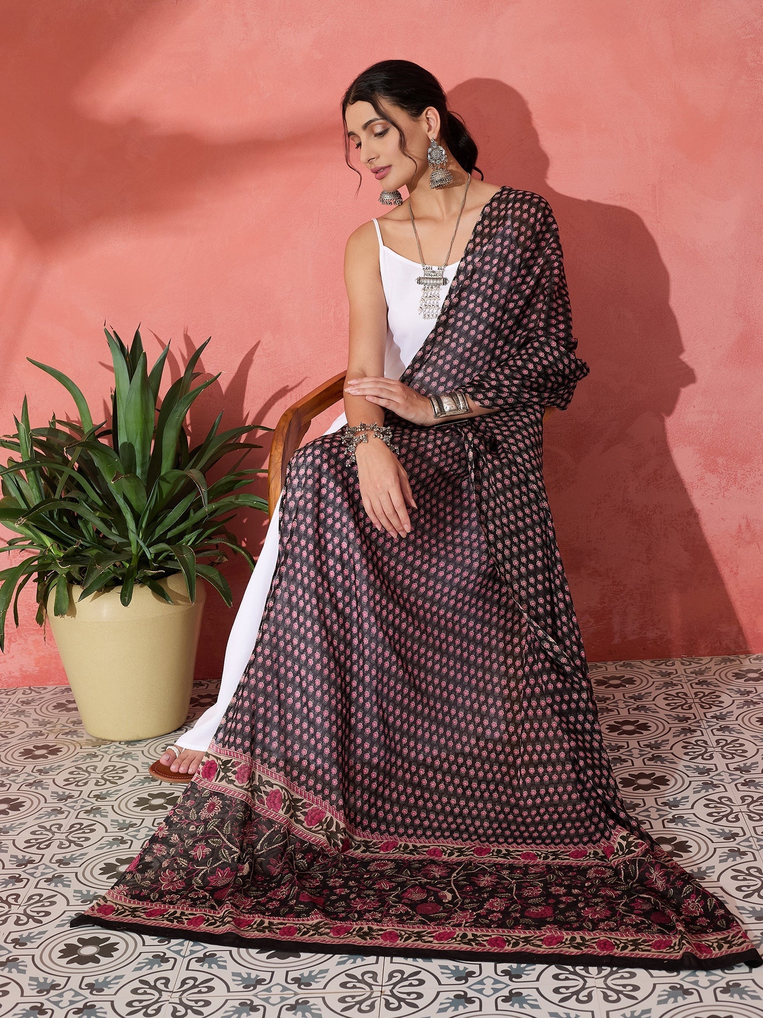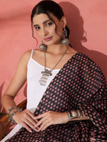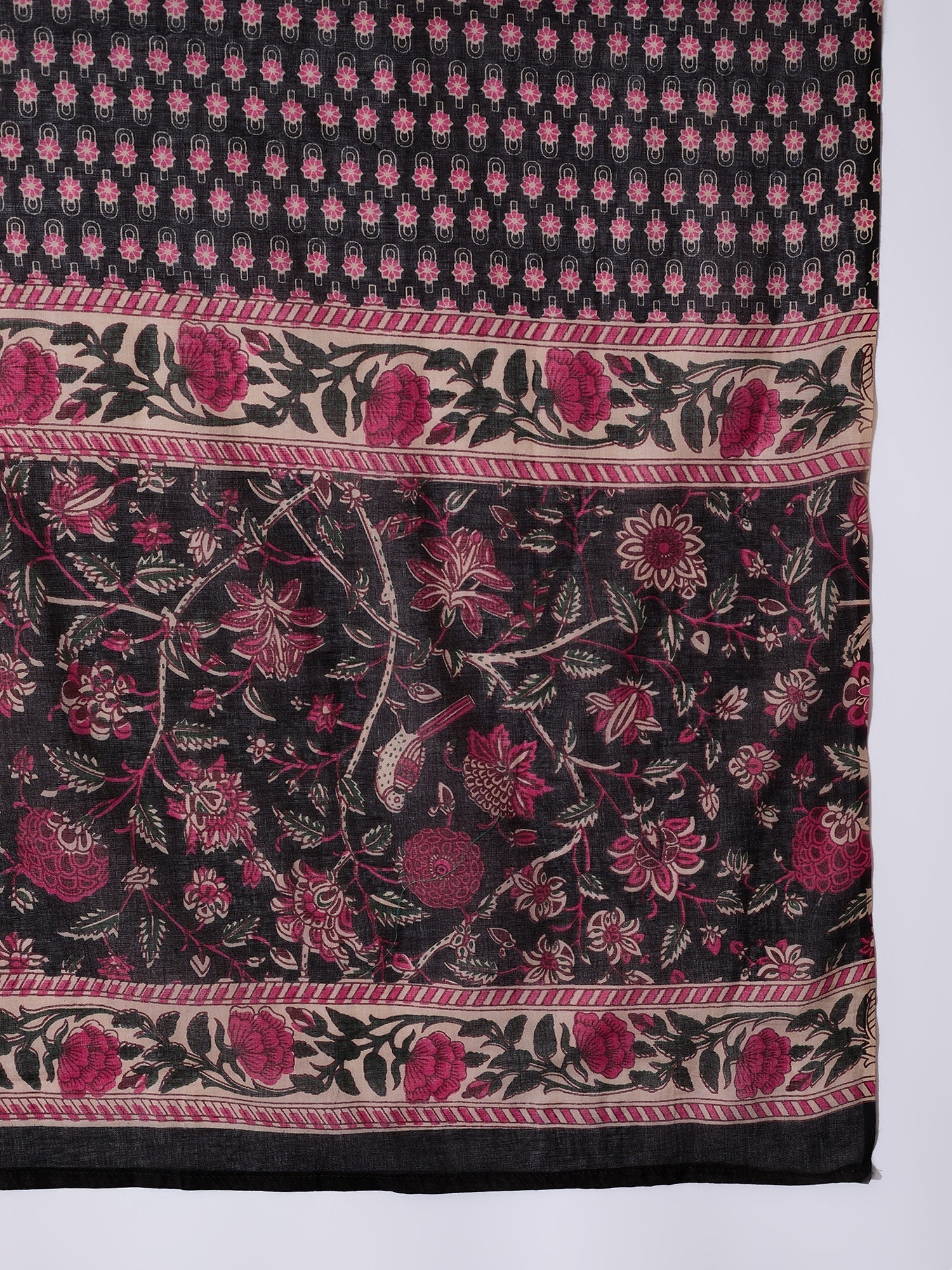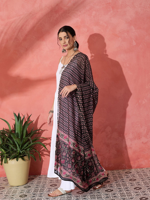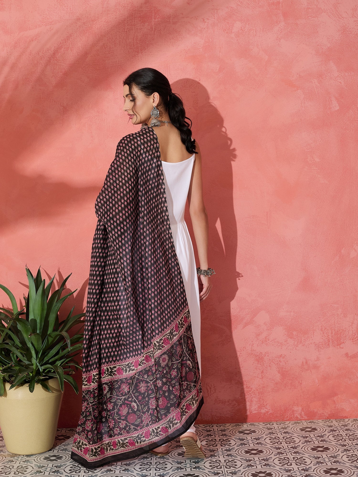 This chic white strappy kurta set is paired with a vibrant black and pink ethnic print cotton dupatta. The bold, traditional patterns on the dupatta add a striking contrast to the simplicity of the kurta, making this outfit a perfect blend of modern and ethnic fashion. Ideal for casual or semi-formal occasions, the set offers both comfort and style.