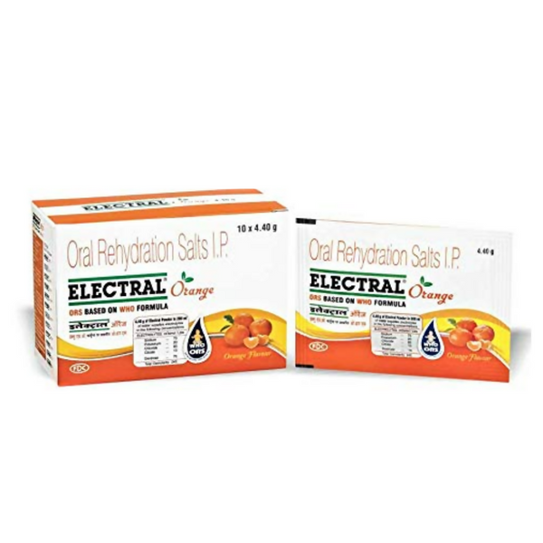 Electral FDC ORS Sachets Orange FlavourBox Containa: 1 pack contains - 10 Sachets This product - pack of 5 - 50 sachets each of 4.40 gm How to use:...