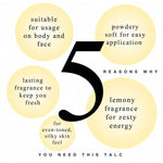 powdery soft and refreshing, the Enchanteur Charming Perfumed Talc is designed to make your skin irresistible. It's a signature fragrance of citrus zest and roses that awakens your senses. Use it and feel fresh and feminine, every day.