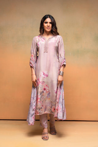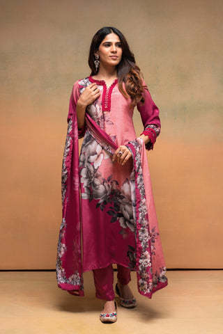 Juniper Pink Floral Embellished A-Line Kurta Pant And Dupatta Set With Beads & Sequence Work