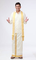 With the rich weave and feel holding everyone in its way, what can be more quintessentially traditional than a Rajavivaha Silk Dhoti? Silk Dhoties are an embodiment of Indian culture and are the perfect wedding wear for men. This traditional piece of attire is timeless in nature and helps you carry yourself in pure elegance on any occasion. Rajavivaha's Silk Dhoti is an ideal gift for weddings, festivals, and special functions, it speaks volumes about class and quality. The blend of gleaming gold zari and the majestic weave of rich cream or white silk woven by an experienced weaver - our Silk Dhoties indeed give you a place of pride anytime, anywhere. Drape yourself in Rajavivaha's Silk Dhoti and carry yourself in magnificence on the most special day of your life.