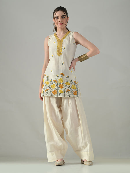Myshka Women Off White Embroidered Short Kurta With Farsi SalwarProduct Details: Package Contains : 1 Kurta, 1 Salwar Shape: A-Line Fabric : Pure ...