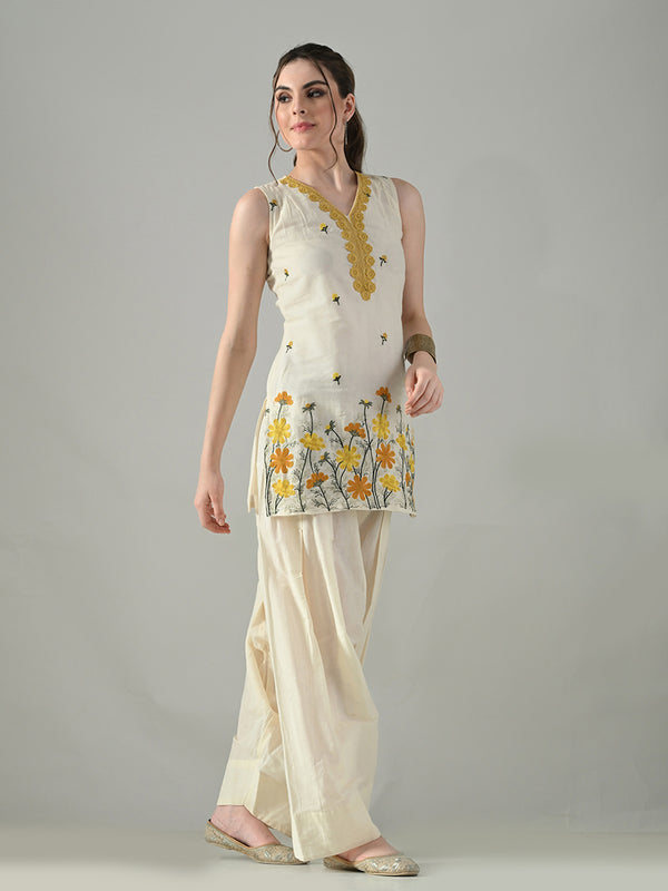 Myshka Women Off White Embroidered Short Kurta With Farsi Salwar