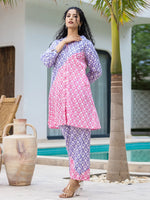 Pink & Purple Colour blocked top, has three quarter sleeves, slip-on closure and regular waist hem