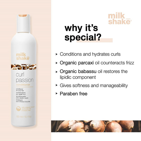 Milkshake curl passion conditioner is paraben free conditioner for curly hair. It is ideal for all hair types to give softness and manageability without weighing hair down. Makes curls bouncy, flexible and long-lasting. Contains organic pracaxi and babassu oils, milk proteins, fruit extracts, Integrity 41 and quinoa proteins.