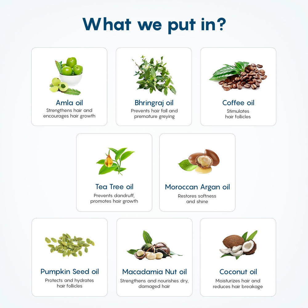 STRENGTHENS HAIR BY 77%: The Natural Hair Strengthening Oil by The Moms Co. is proven to reduce hair fall and strengthens hair with a combination of 8 natural oils which include Amla, Bhringraj, Coffee and Tea Tree oils.