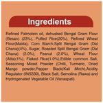 • Refined Palmolein Oil, Dehusked Bengal Gram Flour (Besan)(23%), Puffed Rice (20%), Refined Wheat Flour (Maida), Corn Starch, Split Bengal Gram (Dal Chana)(4%), Sugar, Roasted Split Bengal Gram (Dal Chana) (2.0%), Peanut (2.0%), Wheat Flour (Atta) (1%), Flaked Rice (1.0%), Iodised Salt, Seasoning Mixed Powder (Chili, Turmeric, Dried Mango Powder, Pepper Black (Kali Mirch), Black Salt, Semolina (Rawa) And Hydrogenated Vegetable Oil (Vanaspati)