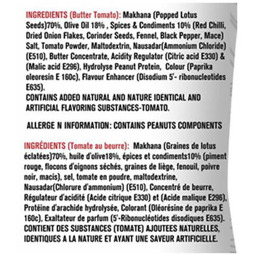 Makhana, Olive oil, Sugar, Spices & Condiments (Red chilli, Dried Onion Flakes, Coriander Seeds, Fennel, Black Pepper, Mace), Salt, Tomato Powder, Maltodextrin, Nausadar (Ins 150), Butter Concentrate, Acidity Regulators (Ins 330) & (INS 296), Hydrolyse Peanut Protein, Colour (Ins 160c), Flavour Enhancer (Ins 635).