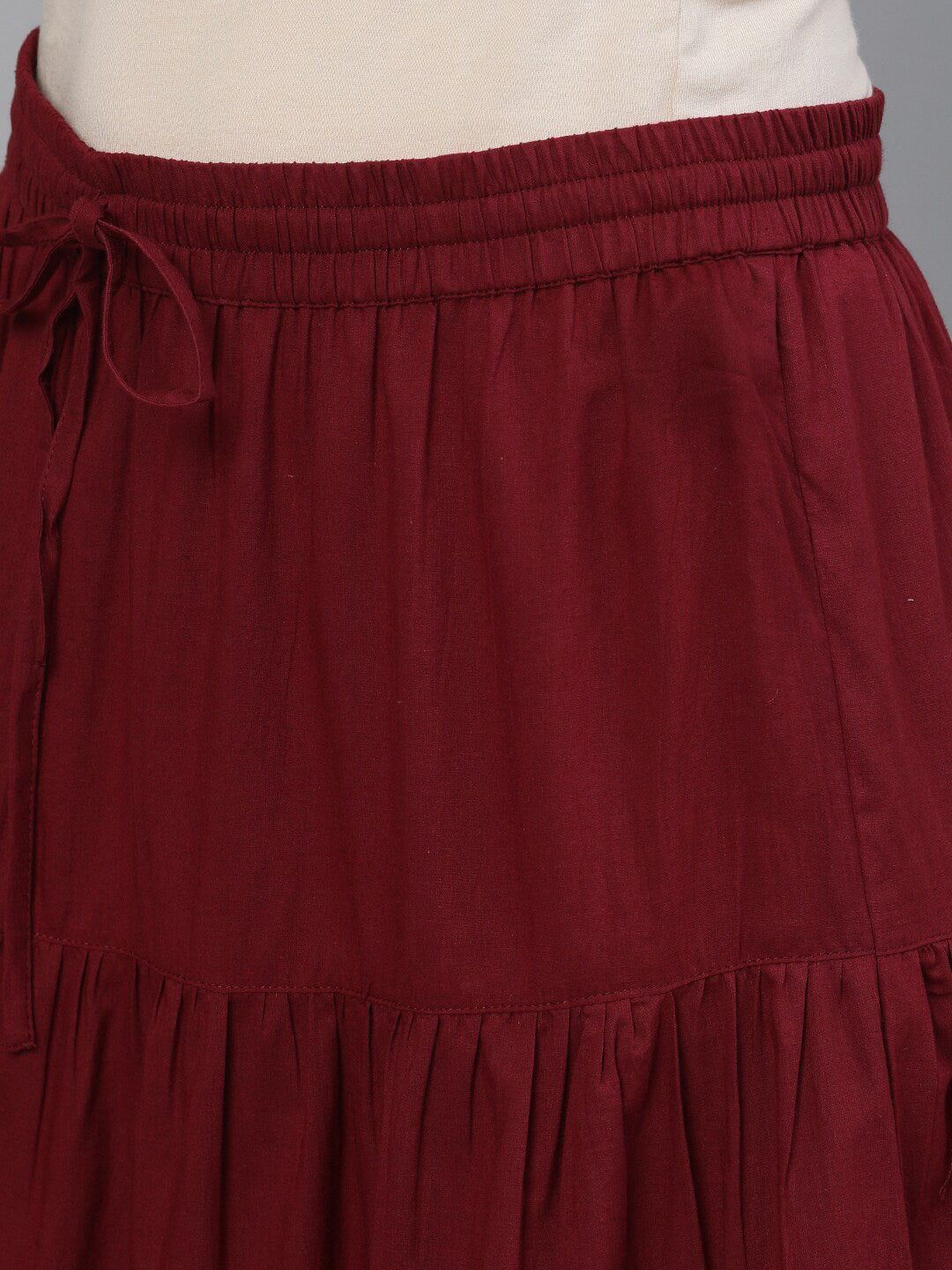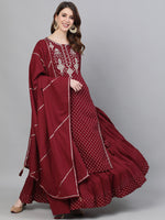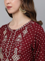 Maroon Yoke Embroidered Straight Kurta Skirt Set, has a Round Neck, Three-Quarter Sleeves, Straight hem, has Side Slits.
