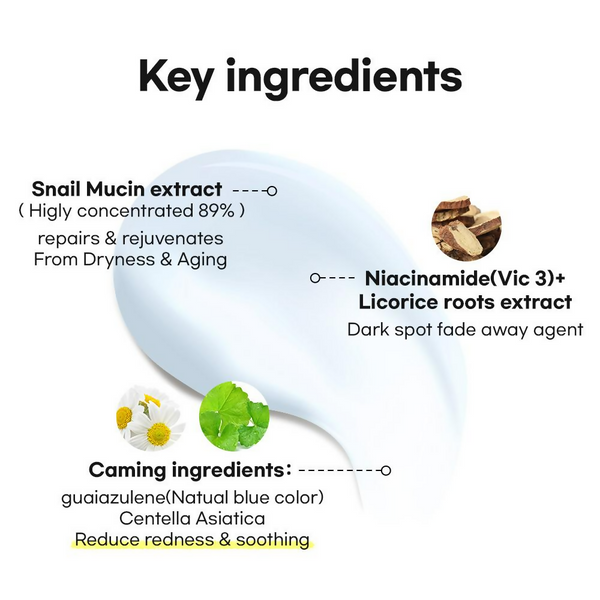 • Naturally derived blue calming ingredients guaiazulene & concentrated snail secretion filtrate provides benefits for calming irritated skin and skin nourishment. A fast-absorbing moisturizer that soothes irritated and sensitized skin after breakouts. It is powered by snail mucin, niacinamide and guaiazulene for instant and long-term hydration for dry, distressed skin.