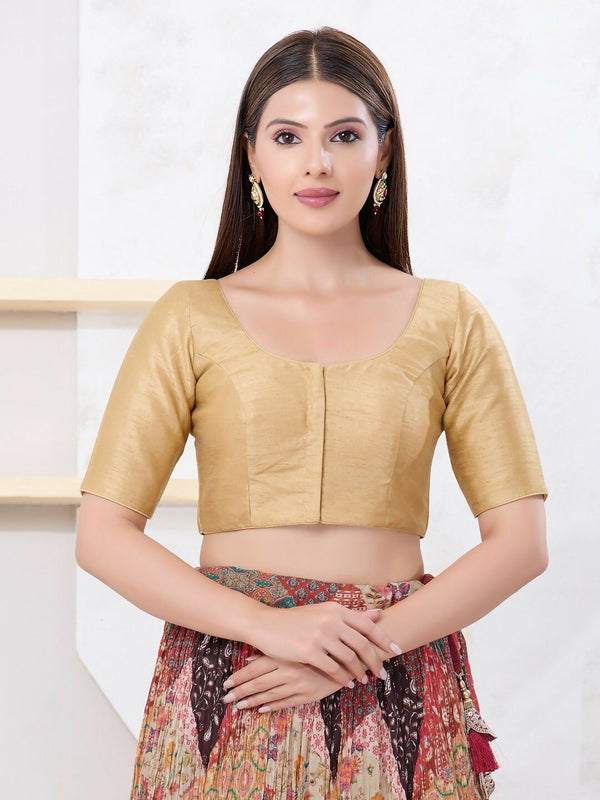 Joban Fashion Gold Dupion Silk Elbow Sleeveless Front Open BlouseProduct Details: Color : Gold Fabric : Dupion Silk Neck : Round Neck Sleeveless : ...