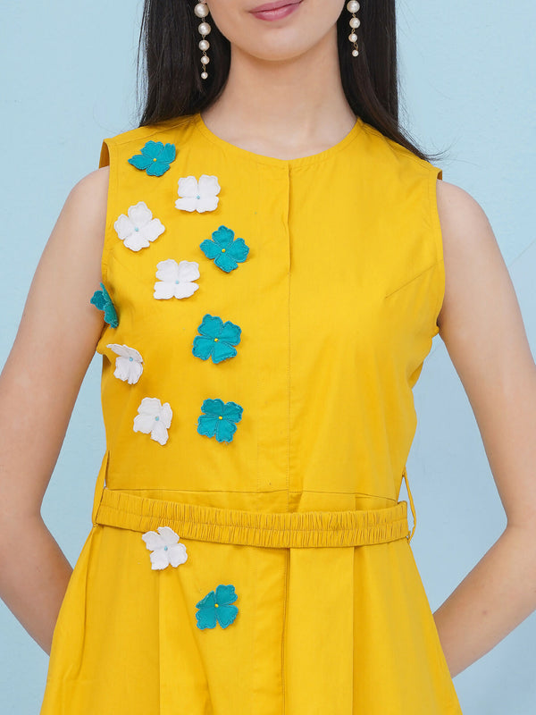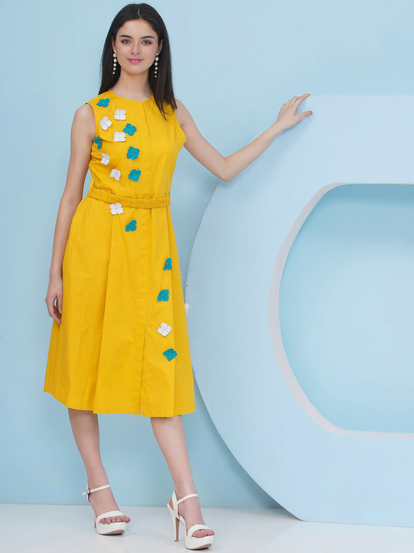 Joban Fashion Yellow Dress with 3D Flower Embroidery and Belt