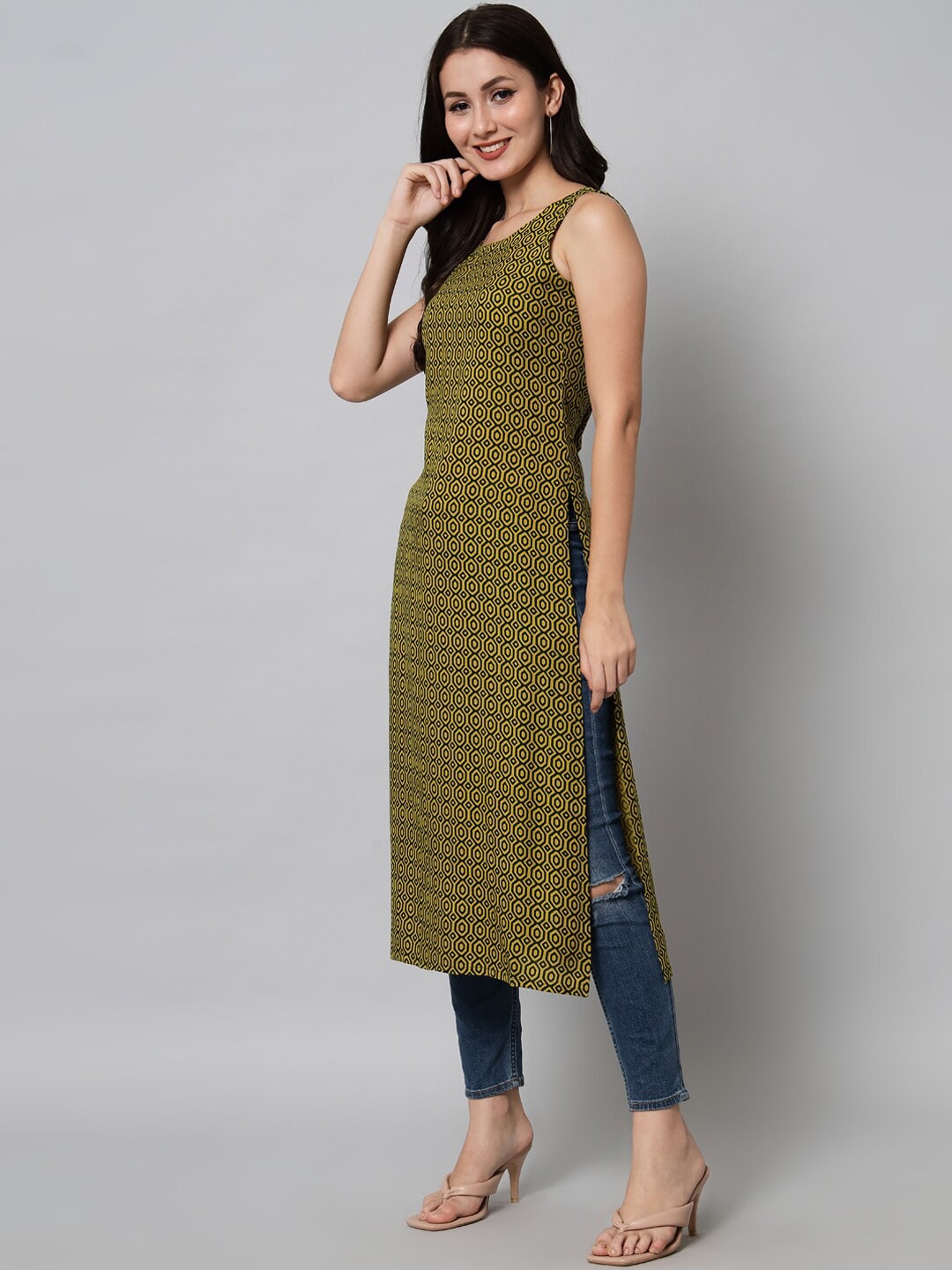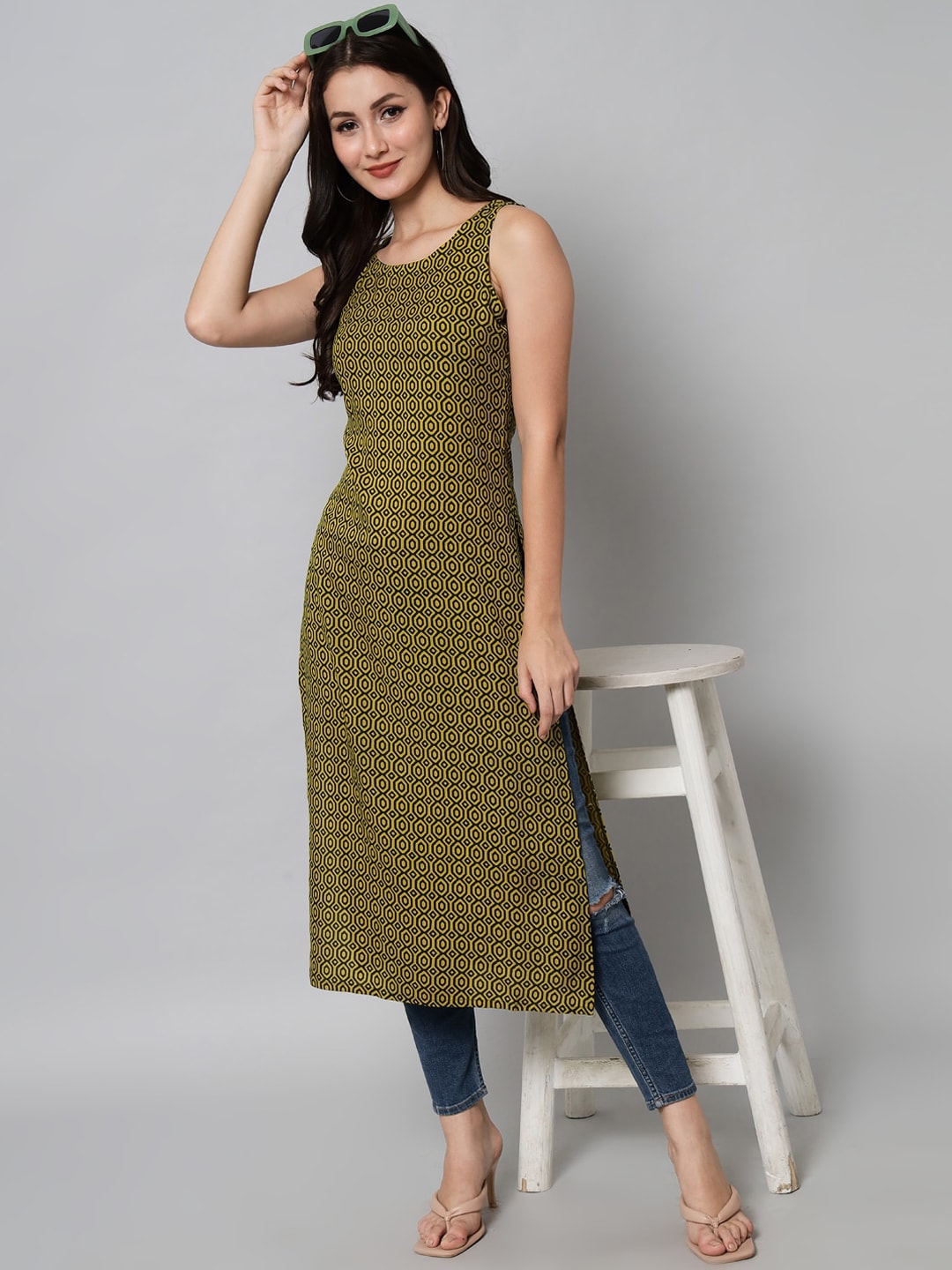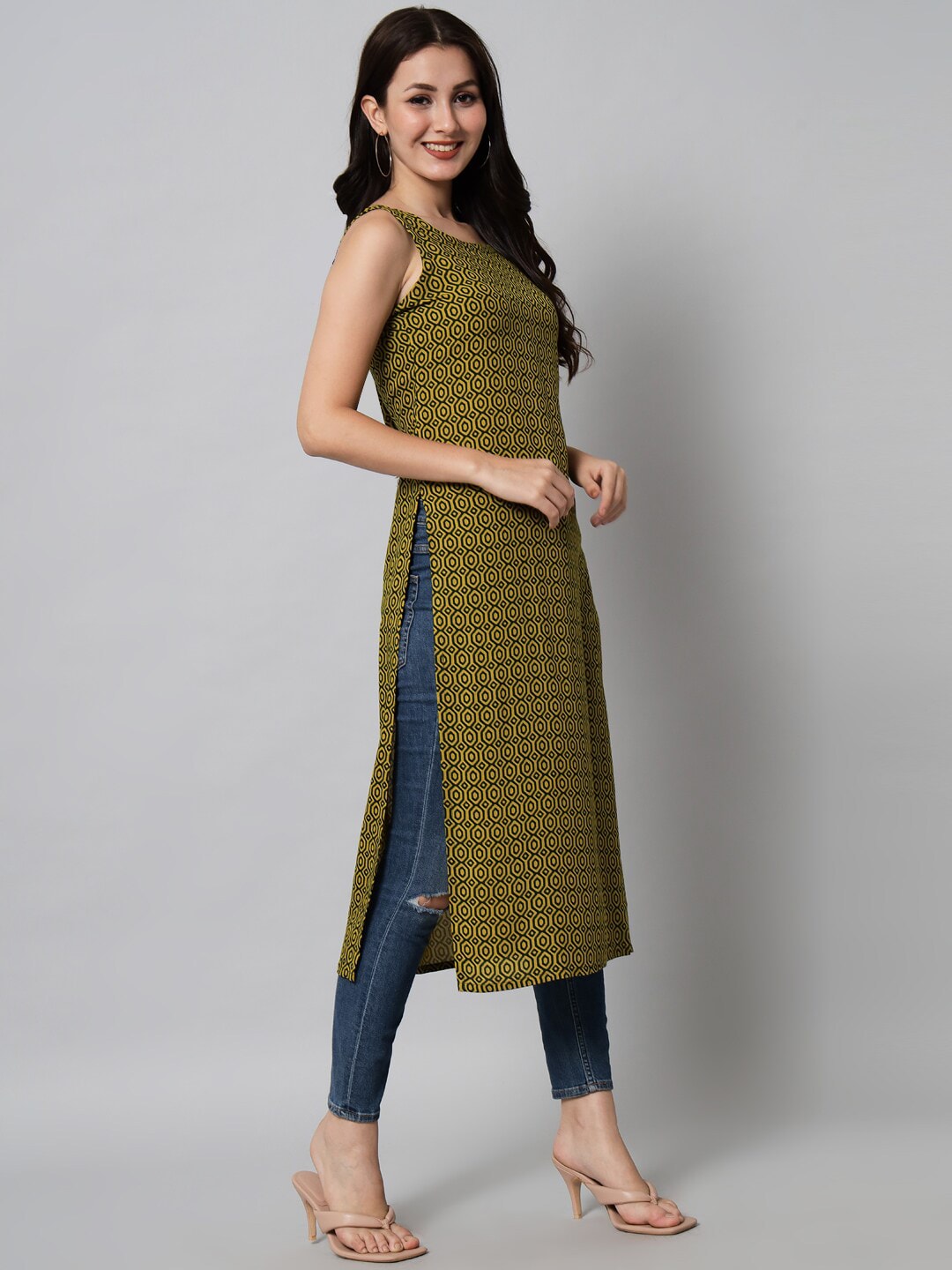 Kalini Women Green Geometric Printed Kurta Product Details Colour: green Geometric printed Round neck Sleeveless, no sleeves Straight shape wit...