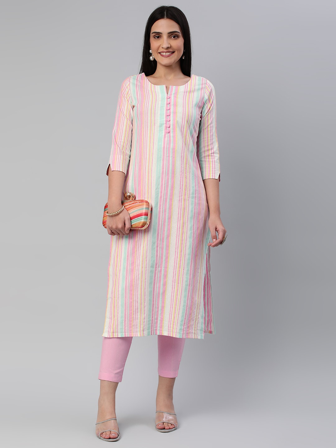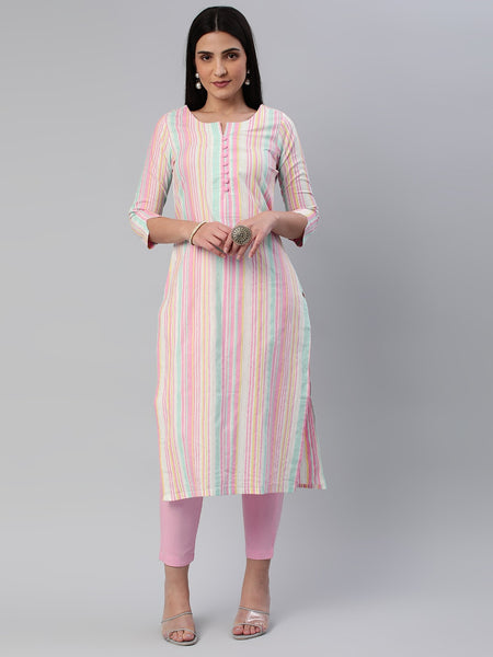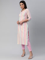 Kalini Women Striped Pure Cotton Kurta With Trousers Product Details Pink striped Kurta with TrousersKurta design: Striped  Straight shape Reg...