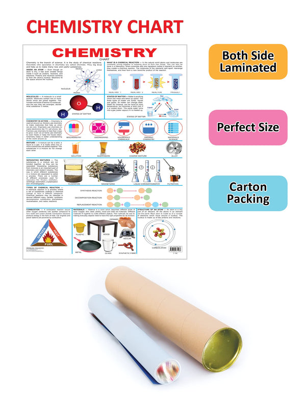 “Chemistry” is a branch of science that studies the structure, properties, and reactions of the chemical elements and compounds they form. ‘Chemistry’ – this wall chart includes detailed images of atoms, molecules, chemical reactions, their types, and more with all important information in an easy-to-read and simple-to-understand text.