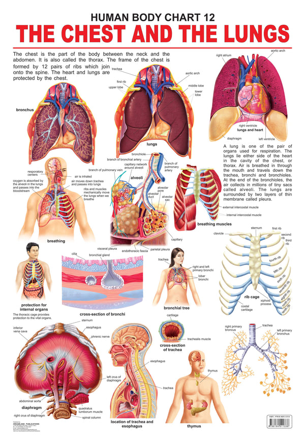 The chest is the area of the human body located between the neck and the abdomen. It contains the lungs, the heart, and part of the aorta. ‘The Chest and the Lungs’ – this wall chart includes detailed images of the chest and the lungs with all important information in an easy-to-read and simple-to-understand text.