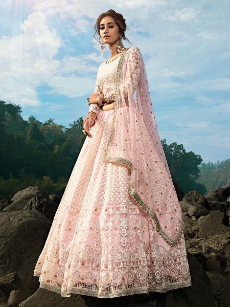 Baby Pink Net Heavy Embroidered Lehenga features a baby pink net blouse , net lehenga , net dupatta. Embroidery is completed with thead , zari and sequence. This style is made in India and checked by hand to ensure high quality.