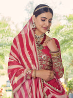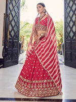 Coral Red Georgette Embroidered Designer Lehenga features a georgette blouse and georgette kameez with georgette dupatta. Embroidery is completed with gotta patti and zari. This Style is made in India and checked by hand to ensure high quality.