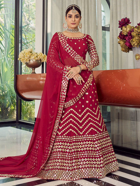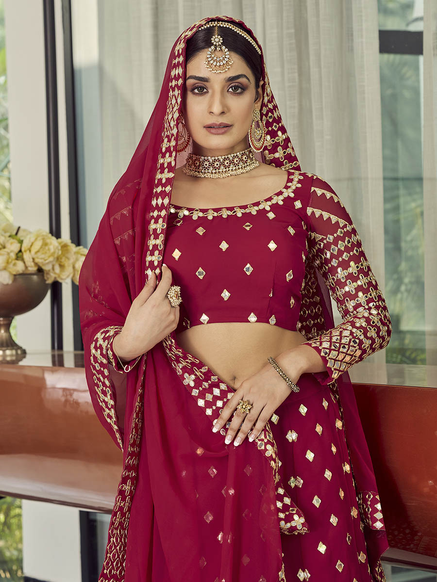 Coral Red Georgette Embroidered Designer Lehenga features a georgette blouse with georgette lehenga with soft net dupatta. Embroidery is completed with sequins , mirror work with thread. This Style is made in India and checked by hand to ensure high quality.