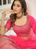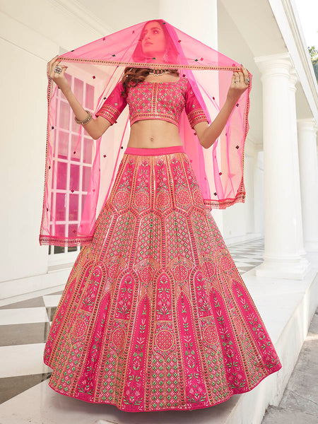 Deep Pink Heavy Embroidered Designer Lehenga features a silk choli , silk lehenga with net dupatta. Embroidery is completed with thread , sequins with stone work. This Style is made in India and checked by hand to ensure high quality.
