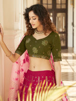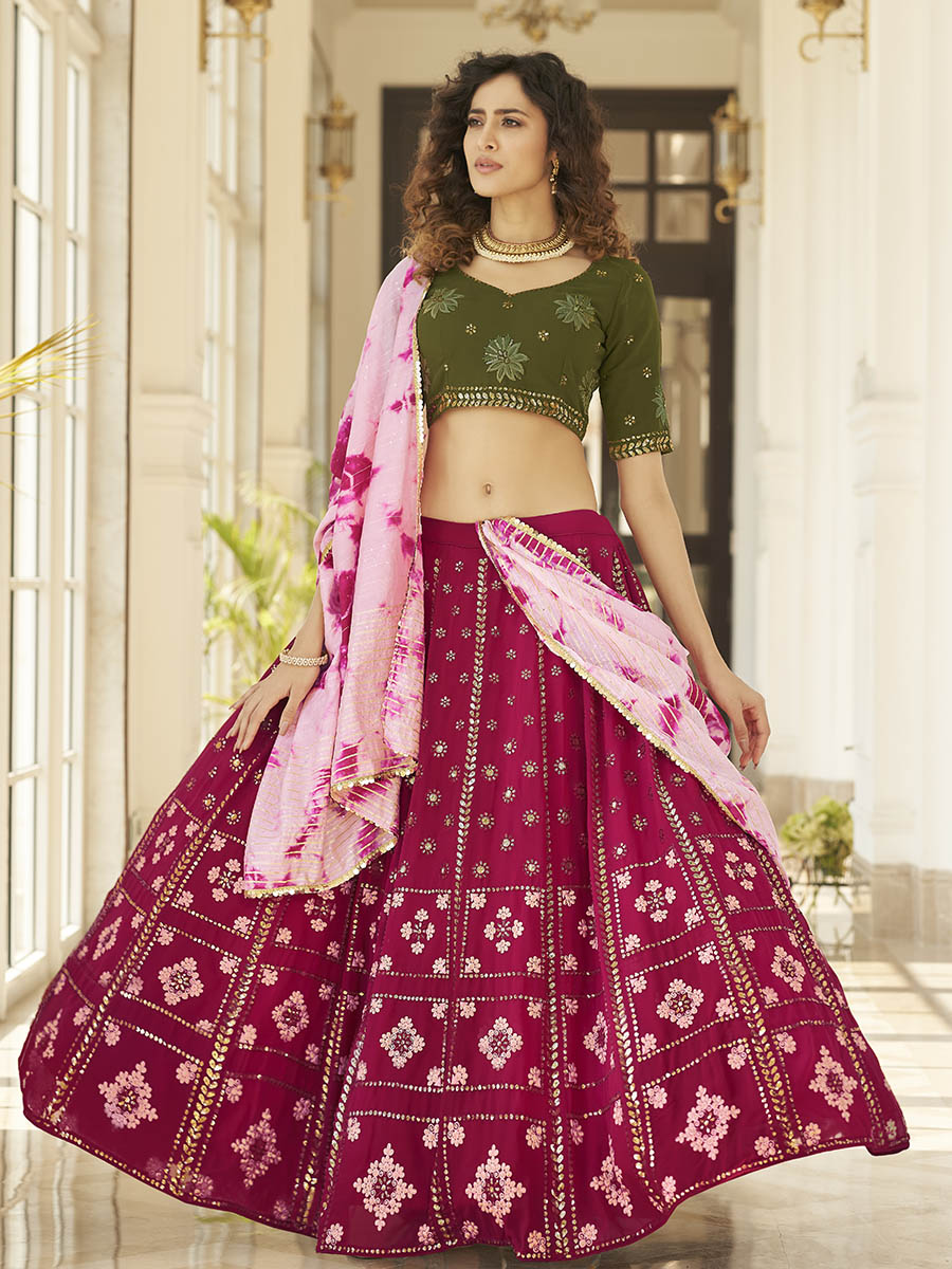 Myra Deep Pink & Olive Green Pink Georgette Embroidered Designer Lehenga - Distacart