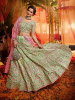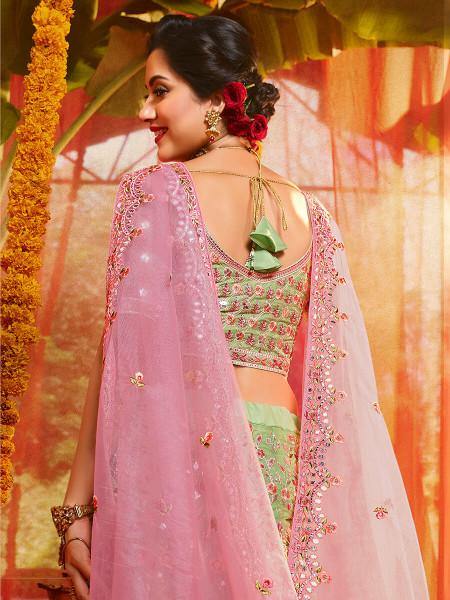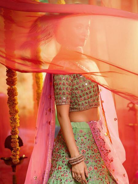 Green and Pure Organza Embroidered Lehenga features a Pure Organza blouse and Pure Organza lehenga with net dupatta.embroidery is completed with Foil Mirror, Thred & Zari.This style is made in India and checked by hand to ensure high quality.