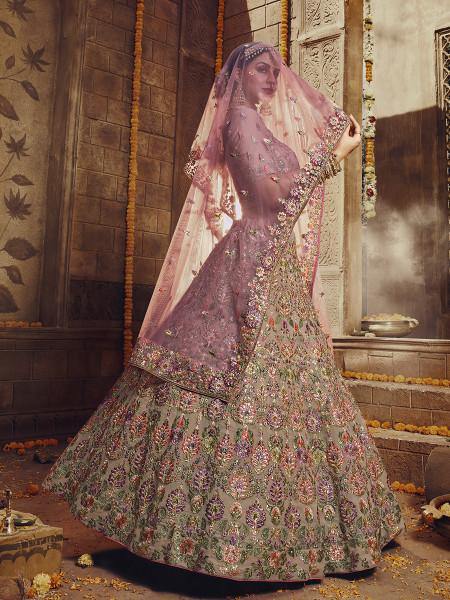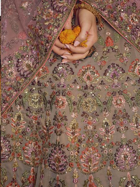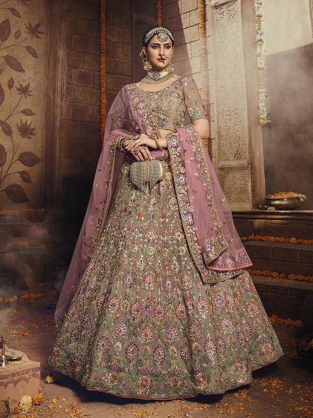 Light Brown Heavy Embroidered Georgette Lehenga features a georgette blouse and georgette lehenga with net dupatta.embroidery is completed with thread,zari,sequence and zarkan.This style is made in India and checked by hand to ensure high quality.