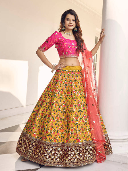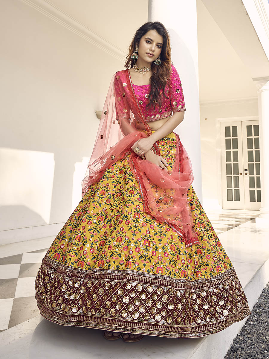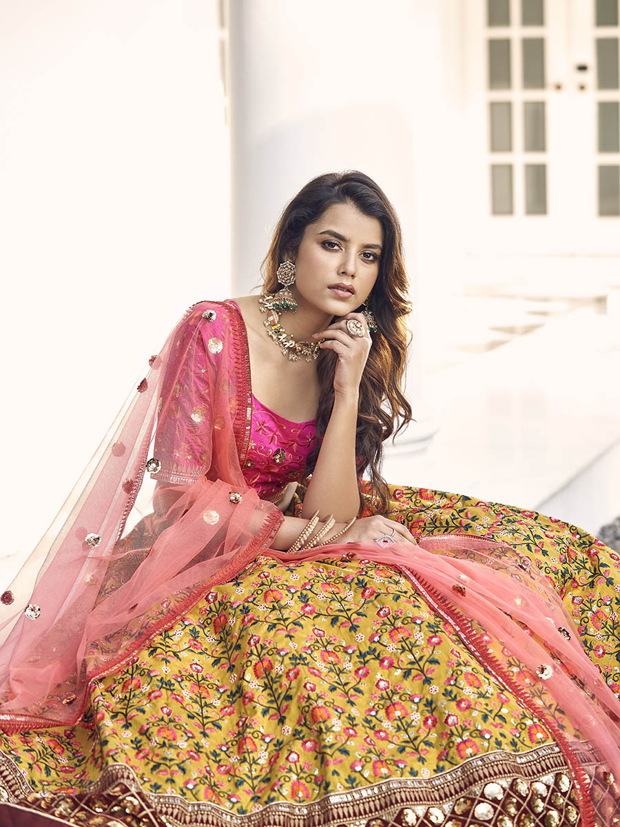 Myra Mustard Yellow and Rani Pink Art Silk Heavy Embroidered Lehenga - Distacart