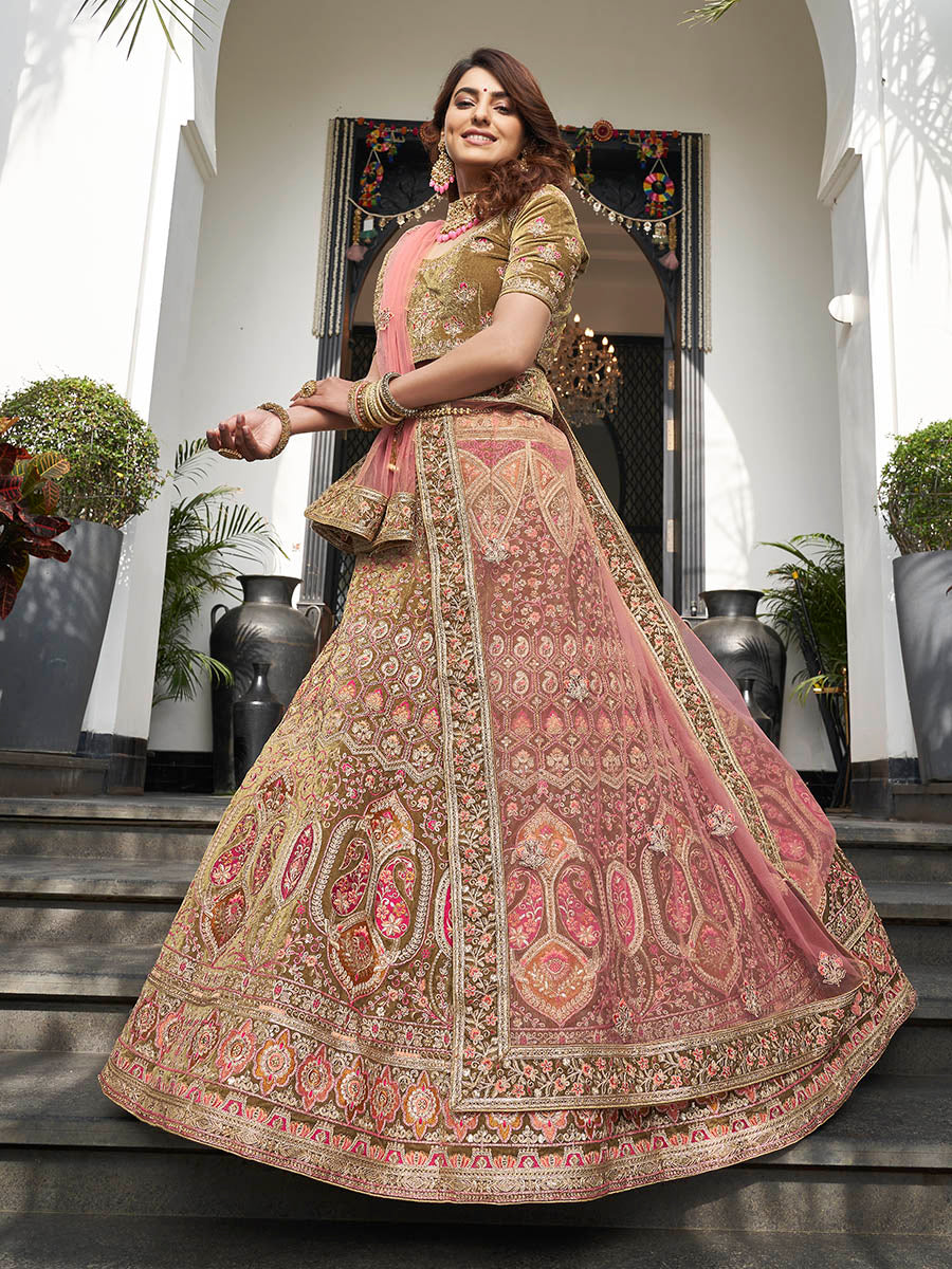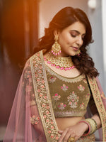 Olive Green Velvet Embroidered Designer Lehenga features a velvet lehenga with velvet choli with soft net dupatta. Embroidery is completed with thread , zari , dori ,sequins and zarkan. This Style is made in India and checked by hand to ensure high quality.