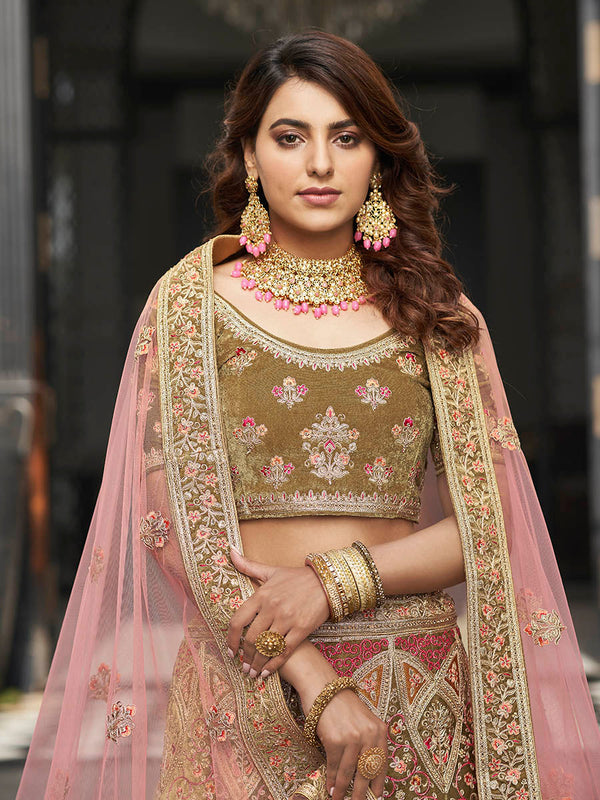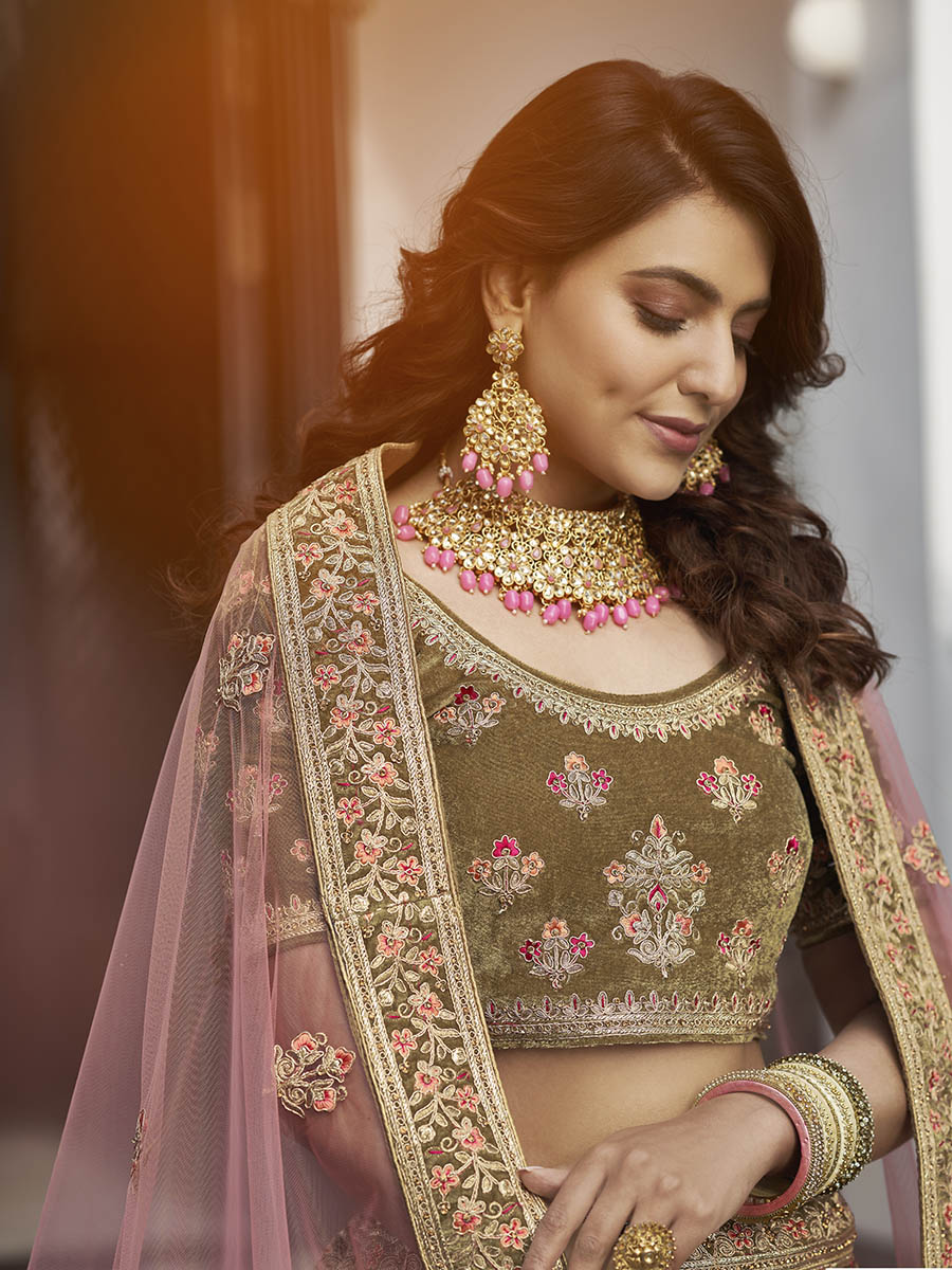 Myra Olive Green Velvet Embroidered Designer Lehenga - Distacart