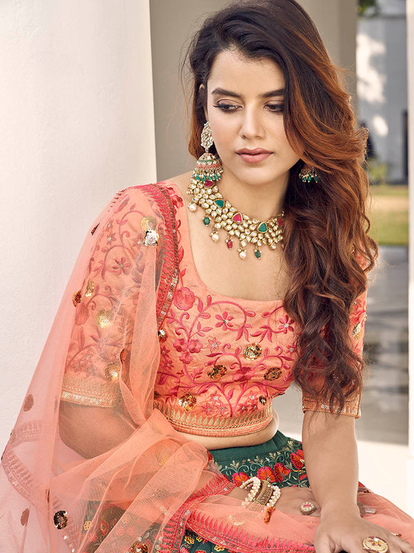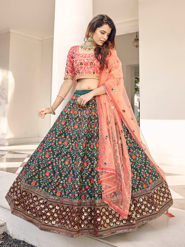 Orange and Green Art Silk Heavy Embroidered Lehenga features a silk blouse with silk lehenga. Embroidery is completed with thread and sequins work. This Style is made in India and checked by hand to ensure high quality.