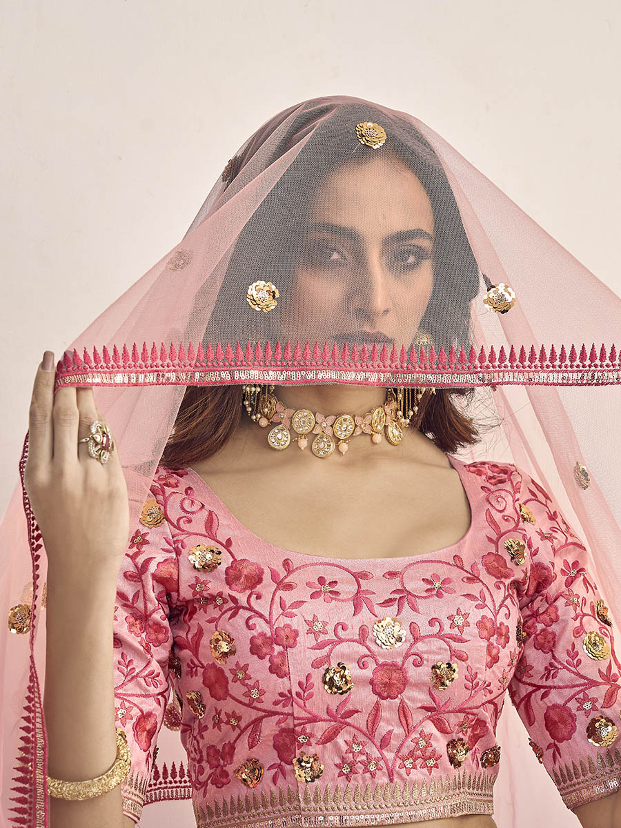 Pink Art Silk Heavy Embroidered Lehenga features a silk blouse with silk lehenga. Embroidery is completed with thread and sequins work. This Style is made in India and checked by hand to ensure high quality.