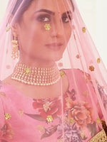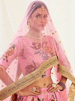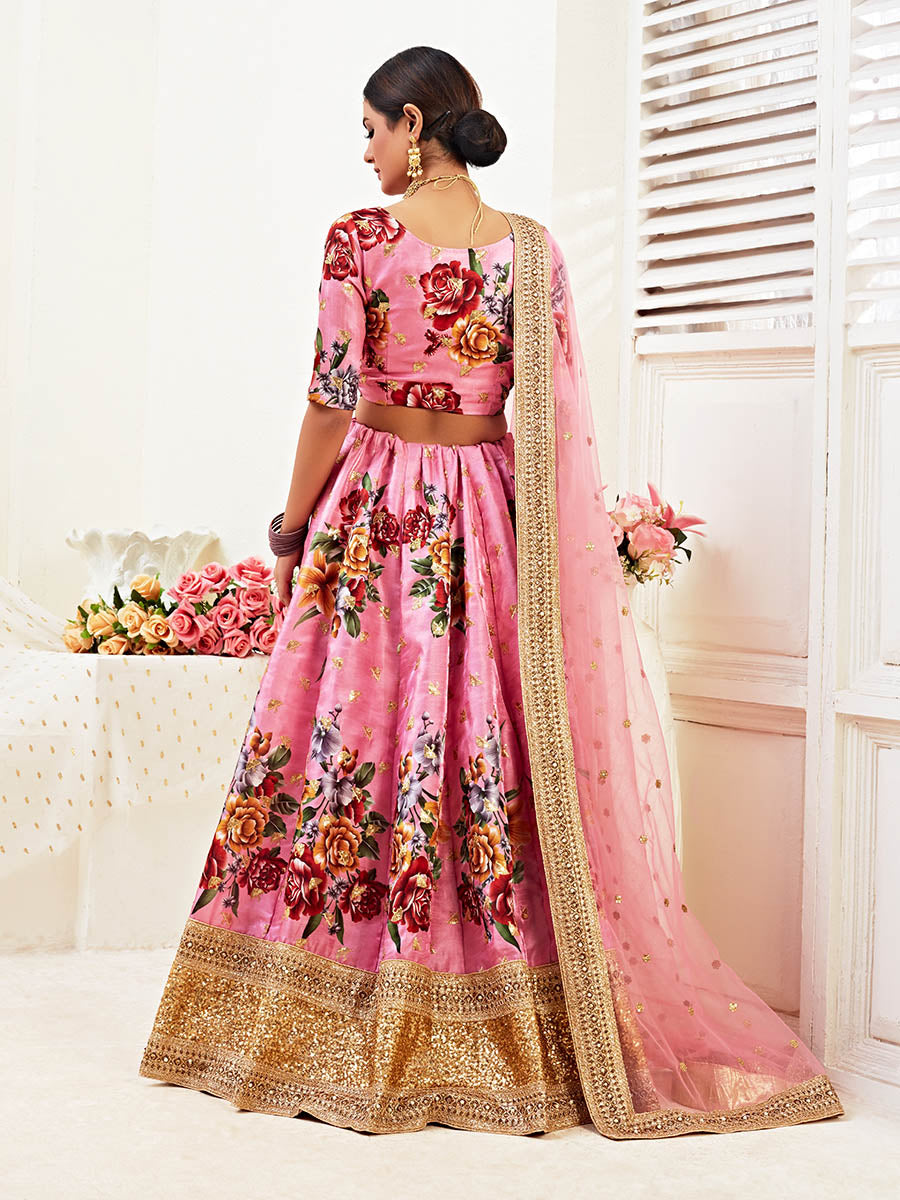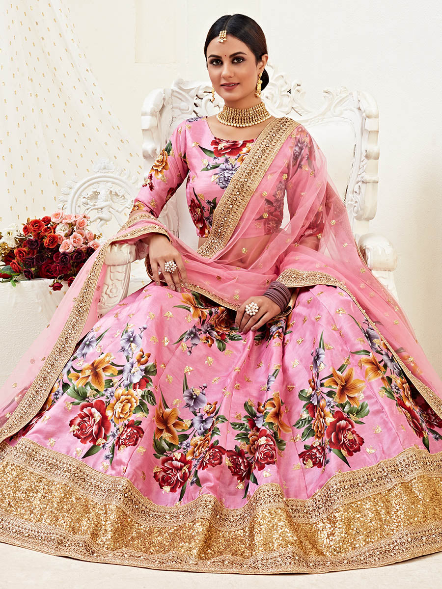 Pink Floral Print Embroidered Designer Lehenga features a banglori satin blouse with banglori satin lehenga with net dupatta. Embroidery is completed with floral print with dori zari and sequins. This Style is made in India and checked by hand to ensure high quality.