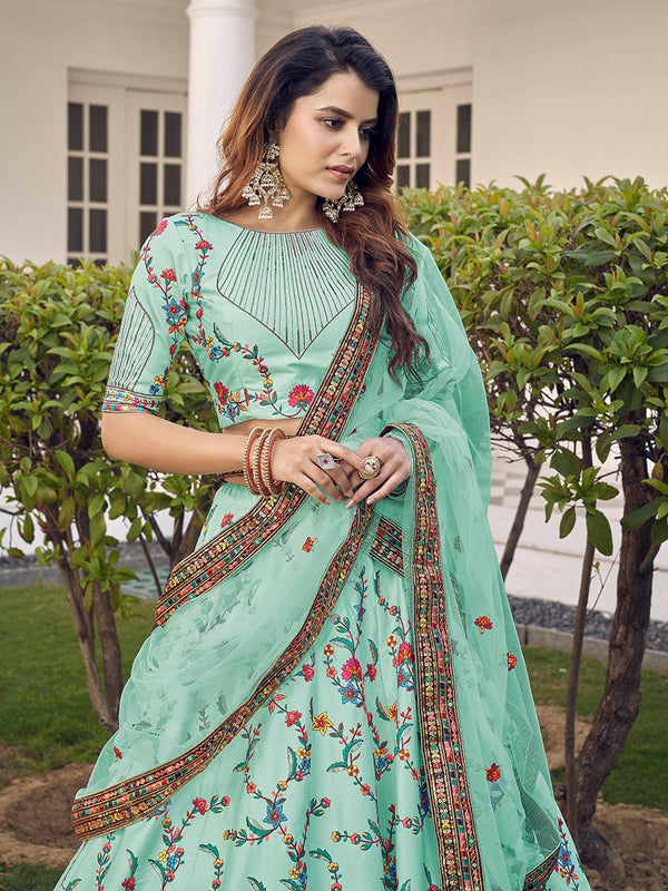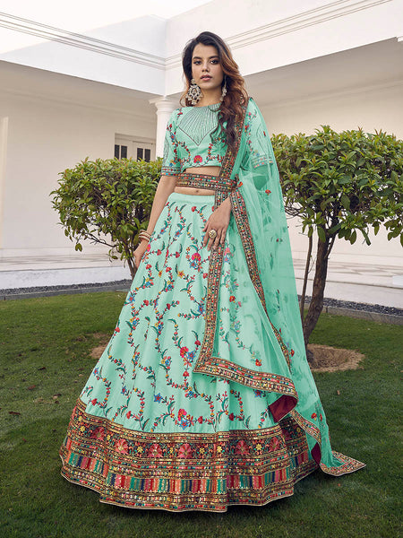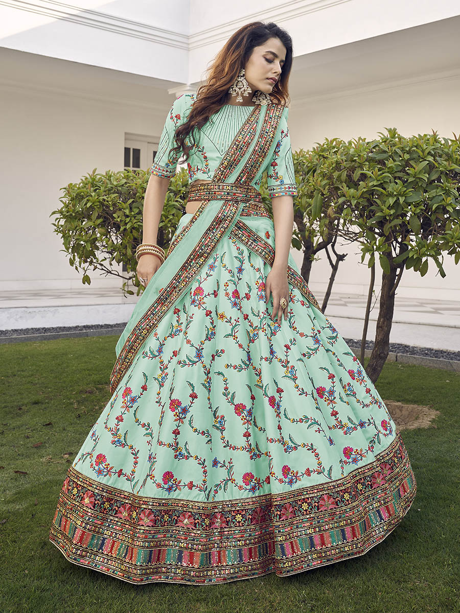 Myra Pista Green Silk Heavy Embroidered Lehenga - Distacart