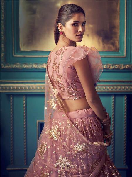 Purpul Heavy Embroidered Net Lehenga features a net top and bottom with santoon inner alongside a net dupatta. Sequin and Thread is used for the embroidery of this style.