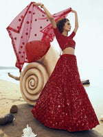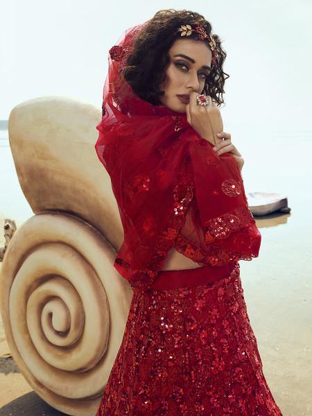 Red Embroidered Net Lehenga features a net top and bottom with santoon inner alongside a net dupatta. Sequin is used for the embroidery of this style.