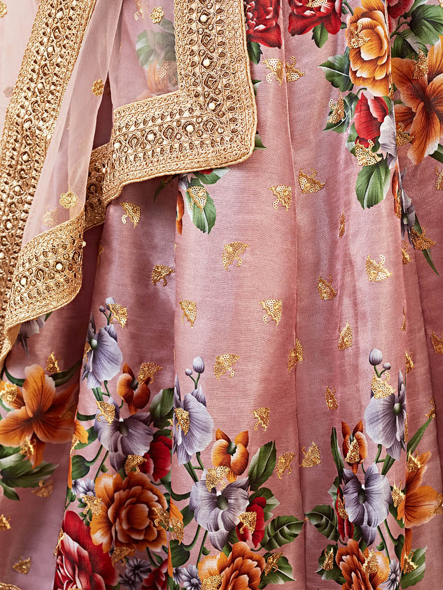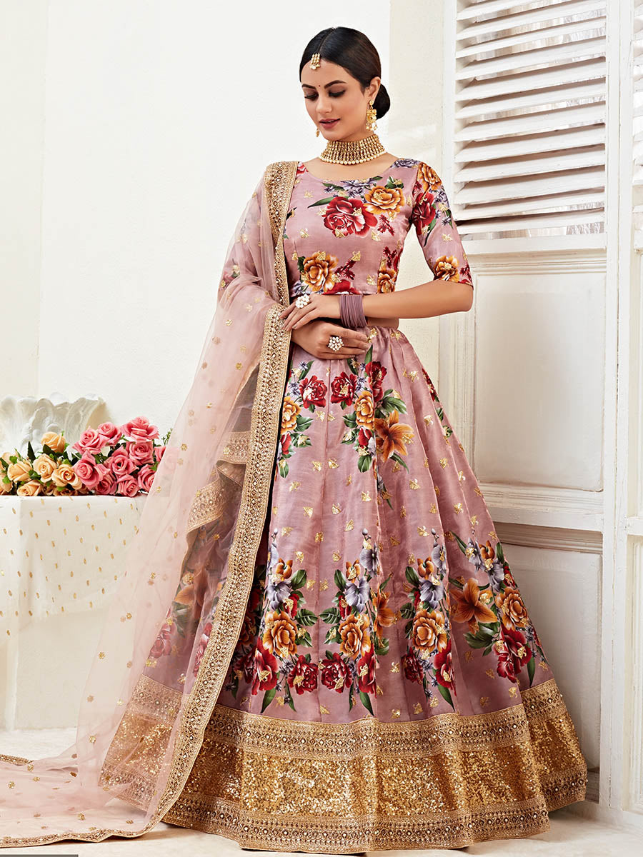 Rosy Brown Floral Print Embroidered Designer Lehenga features a banglori satin blouse with banglori satin lehenga with net dupatta. Embroidery is completed with floral print with dori zari and sequins. This Style is made in India and checked by hand to ensure high quality.