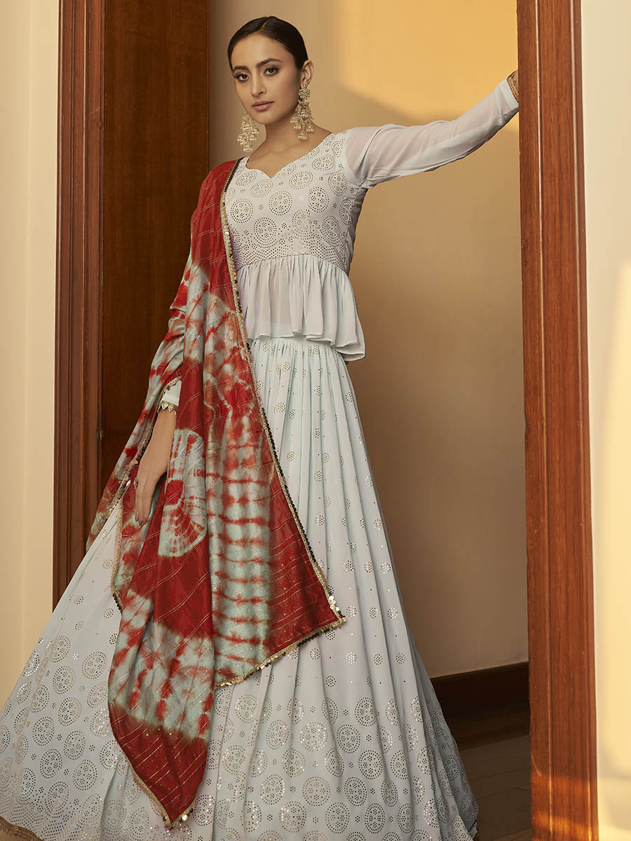 Sky Multicolour Shibori Print Designer Lehenga features a georgette lehenga with georgette choli with cotton dupatta. Embroidery is completed with sequins and shibori print. This Style is made in India and checked by hand to ensure high quality.