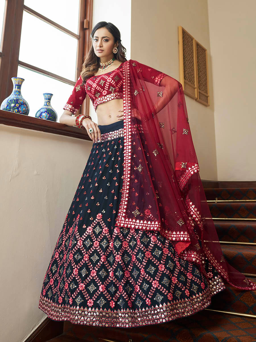 Myra Teal Blue and Maroon Georgette Embroidered Party Wear Lehenga - Distacart