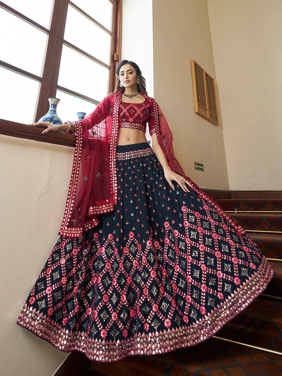 Teal Blue and Maroon Georgette Embroidered Party Wear Lehenga features a georgette blouse with georgette lehenga with net dupatta. Embroidery is completed with gota patti , thread and sequins work . This Style is made in India and checked by hand to ensure high quality.