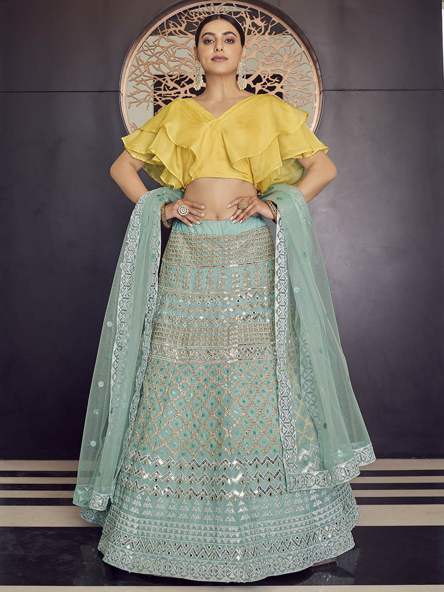 Myra Turquoise Organza Embroidered Designer Lehenga - Distacart