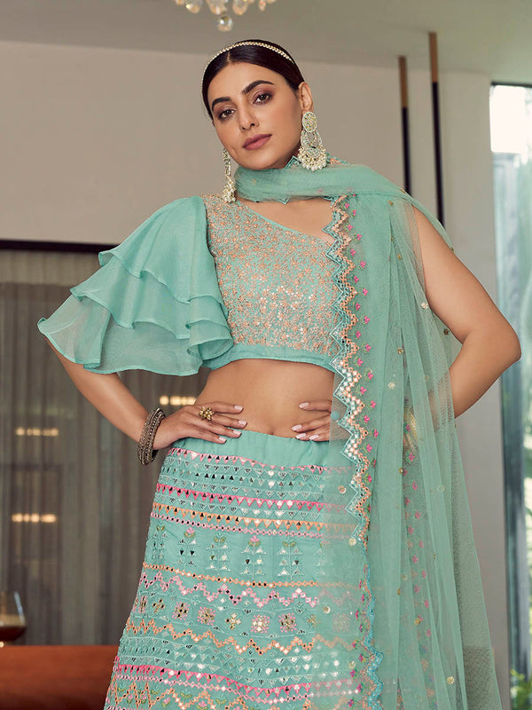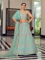 Myra Turquoise Organza Floral Print Embroidered Designer Lehenga - Distacart