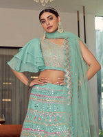 Turquoise Organza Floral Print Embroidered Designer Lehenga features a Organza blouse , organza lehenga with soft net dupatta. Embroidery is completed with gotta pati, thread and beads. This Style is made in India and checked by hand to ensure high quality.