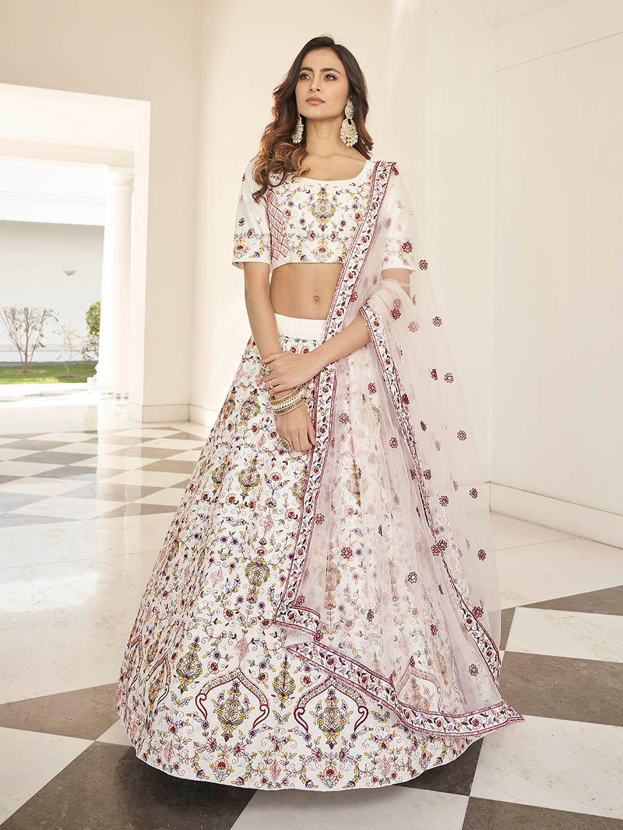 White Heavy Embroidered Designer Lehenga features a silk choli , silk lehenga with net dupatta. Embroidery is completed with thread , sequins with stone work. This Style is made in India and checked by hand to ensure high quality.