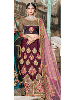 Wine Embroidered Lehenga features a Pure Taffeta top and bottom with santoon inner alongside a soft net dupatta. Dori, Thread & Sequins is used for the embroidery of this style.