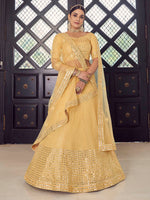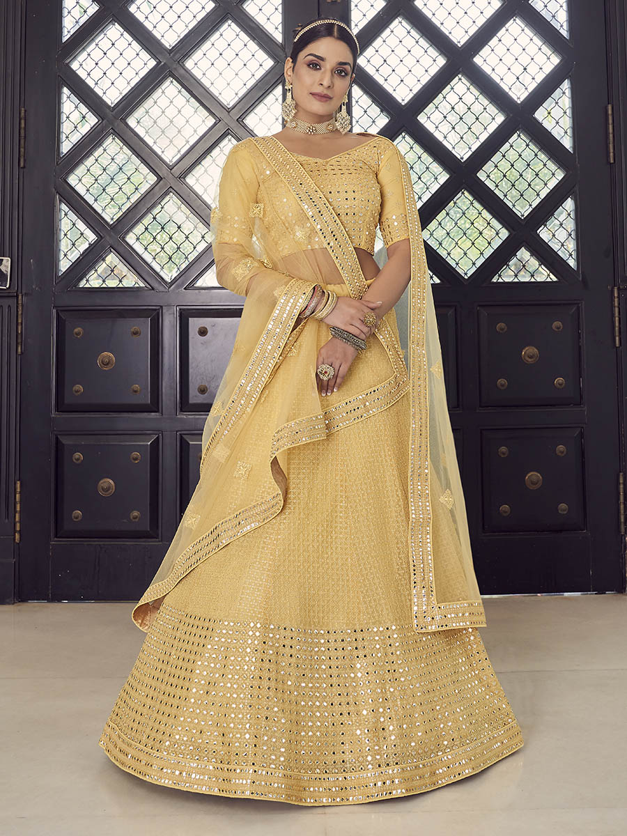Yellow Georgette Embroidered Designer Lehenga features a georgette blouse with georgette lehenga with soft net dupatta. Embroidery is completed with sequins , mirror work with thread. This Style is made in India and checked by hand to ensure high quality.