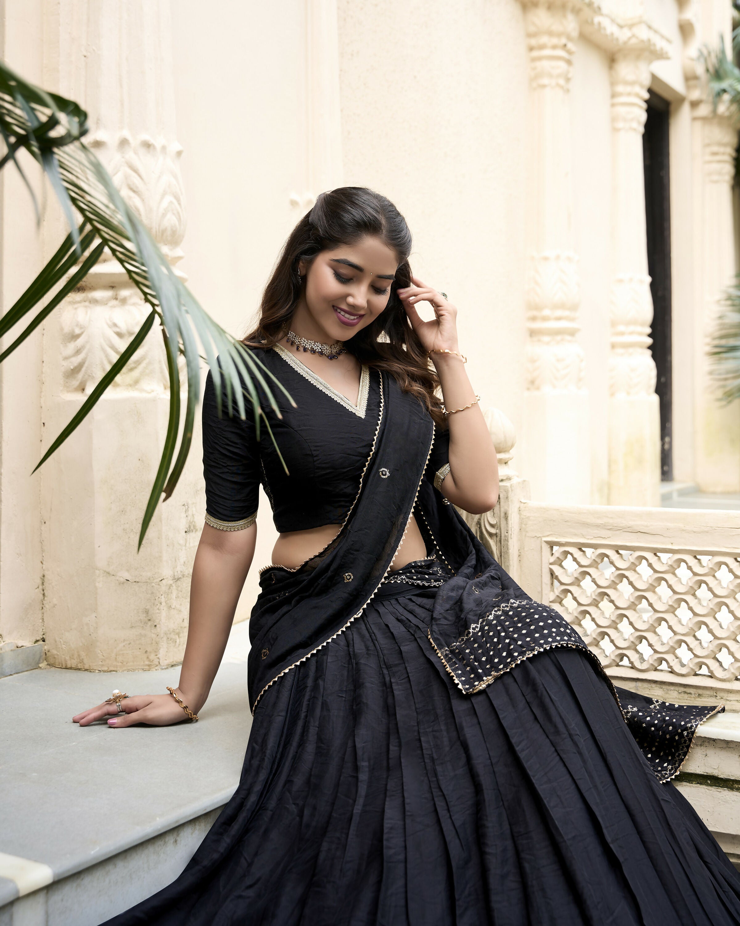 Lorenvalley Black Pure Chanderi Plain With Zari Weaving Work Border Lehenga CholiCrafted for Grace and Beauty: Pure Chanderi Plain Lehenga with Int...
