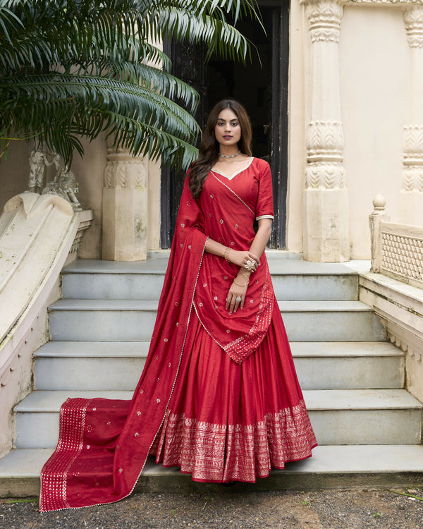 Lorenvalley Red Pure Chanderi Plain With Zari Weaving Work Border Lehenga CholiCrafted for Grace and Beauty: Pure Chanderi Plain Lehenga with Intri...