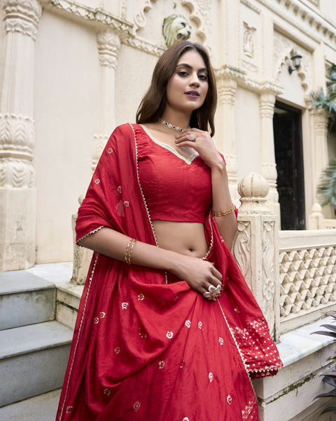 Lorenvalley Red Pure Chanderi Plain With Zari Weaving Work Border Lehenga Choli
