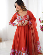 Lorenvalley Rust Soft Organza Silk With Floral Print Fully Flared Anarkali Pant With Dupatta Set - Distacart